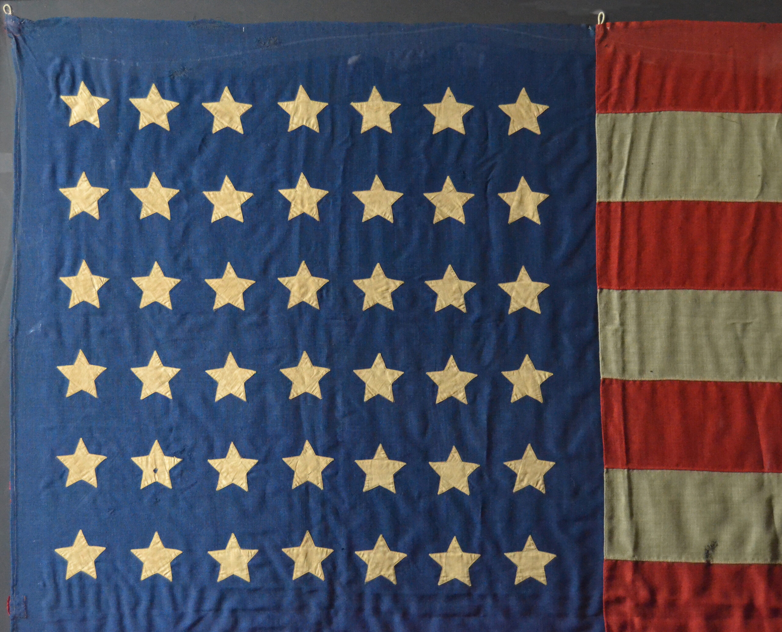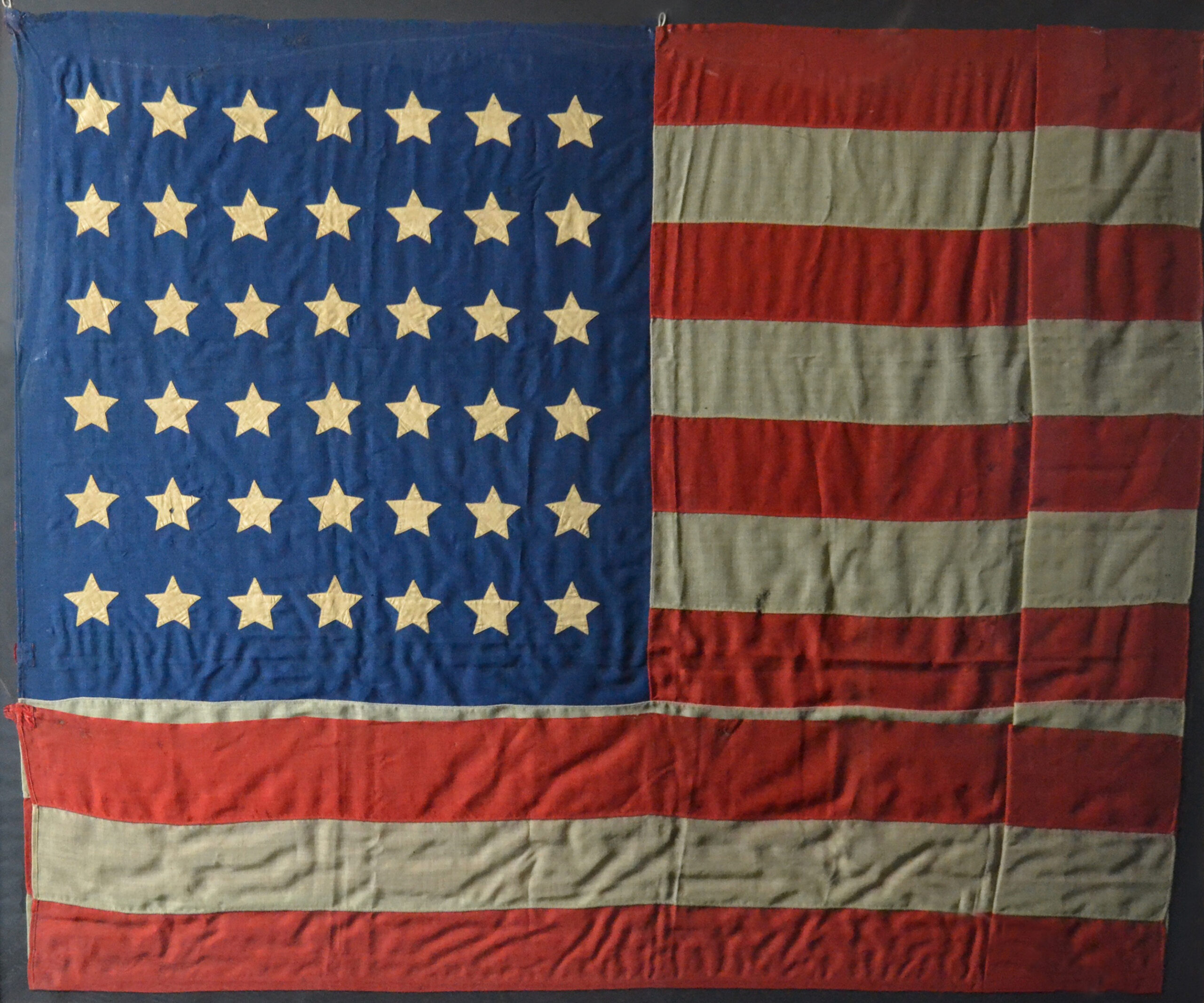 Authentic antique 42 star flag; 42 Star flags like this are very rare as they were only used for a very short time. Congress voted the 42nd State into the Union on November 11,1889. However a state does not become official till the following July 4th. In the following year 1890 five States became official on July 4th 1890. So this is called an UN-official flag. Probably made by the Governor of the State to celebrate its entry to the Union.