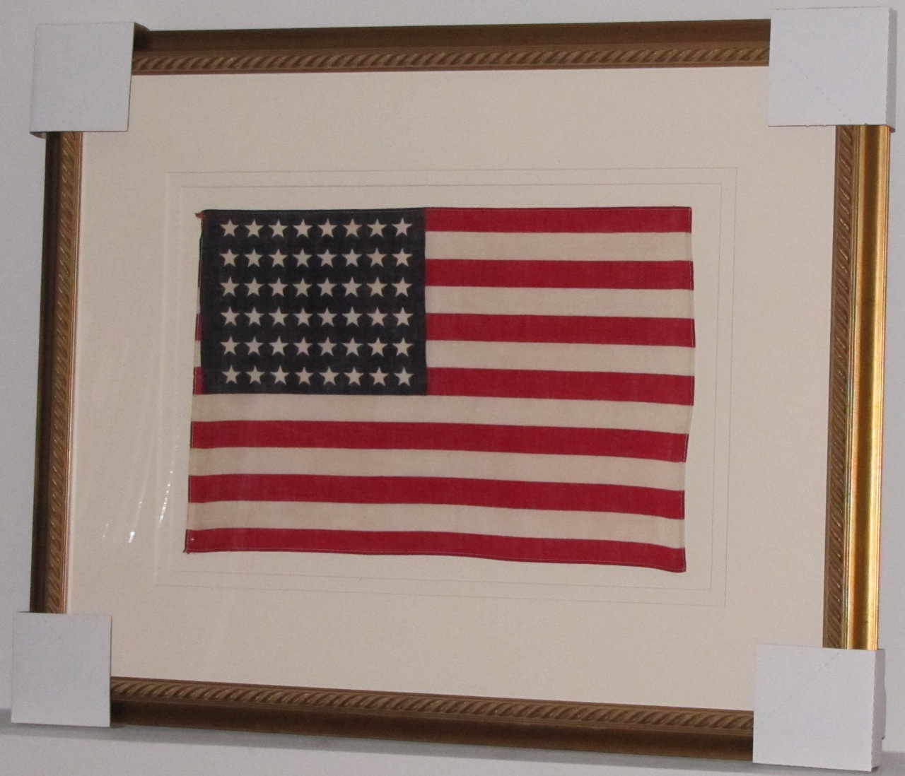 Nice printed cotton 48 Star Parade Flag made & used during the WWII era. Has stitched edges, some tatters where flag apparently was ripped from the attached stick. Age, wear, stains & use is apparent. Rarity Rating; 1 Rated on a scale of 1 to 5, 5 being the rarest. This flag rates a { 1 } and is priced accordingly. Each framed flag has archival framing with UV acrylic protection. Please email for price and shipping cost, Please refer to item number. Each flag comes with a Certificate of Authenticity. A genuine antique American Flag. Note! Flags are photographed in bright light and with flash equipment. Flags are actually darker and show true age and blemishes in person. Please refer to item number when requesting Pricing. Thank you for your interest.