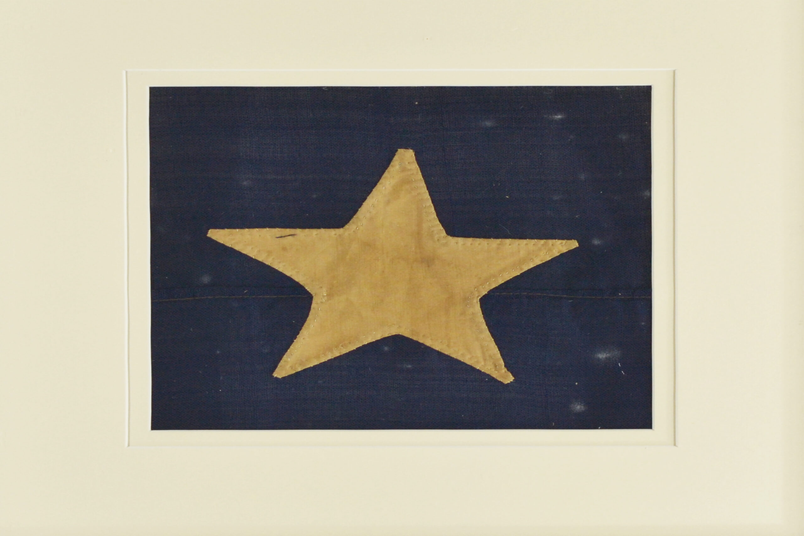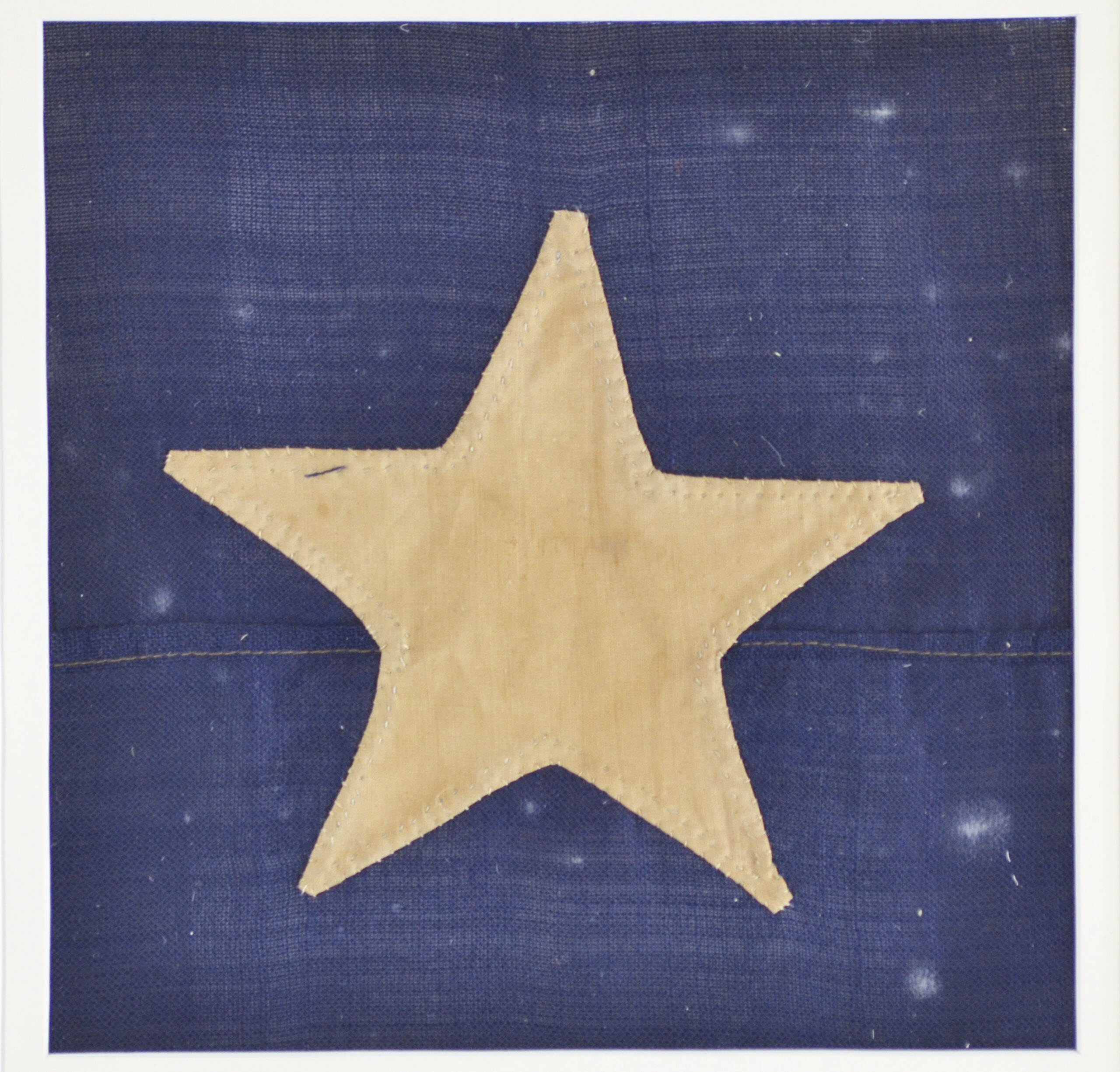 The flag was found in terrible condition. It was cost prohibitive to restore and or frame the flag as it was falling apart. It had major damage and heavy wear from age & the weather. The only salvageable part of the flag were some of its stars. The star itself measure 6″ across. It has been framed so you can see the front and the back of the star. The star is called a peek-a-boo star as the maker did not make two stars, she cut a star shape out of the blue canton and sewed the white star to the front of the flag and hemmed the blue canton around the star on the back so the white star shows thru on the backside.