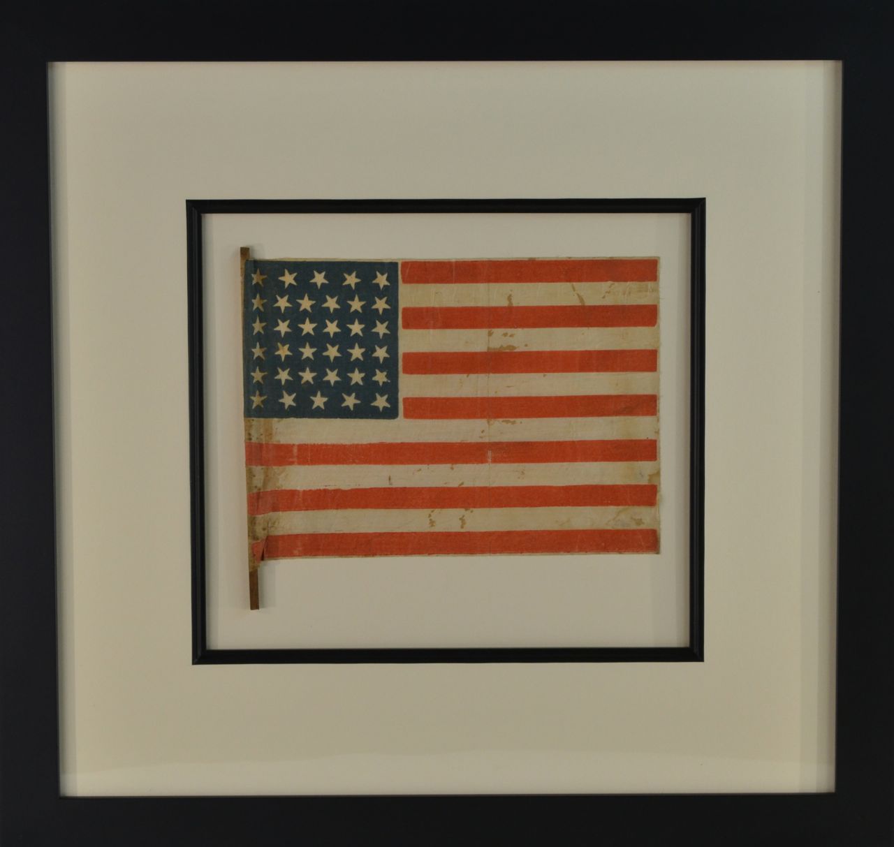 Our in-house professional framers use only conservation framing methods used by museums. We only use acid free cotton rag mats and gas free materials along with safe ultra-clear UV acrylic. The UV acrylic is clearer than glass and unlike glass it will not break. Our flags are museum mounted using safe acid free hinges, which does not damage the flag in any way like sewing flags down does. The hinge mounting is completely reversible which is the prime focus to achieve in conservation framing.