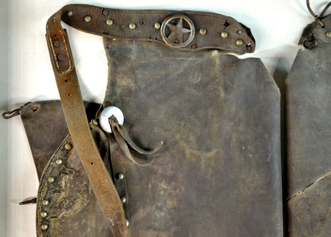 Rare antique Leather Chaps. Found in Texas about 15 years ago. Verbal history is said that they were from a soldier who served in the Confederate Texas Calvary. Elaborate brass button work and nickle plated conch’s with a star pin next to the belt.