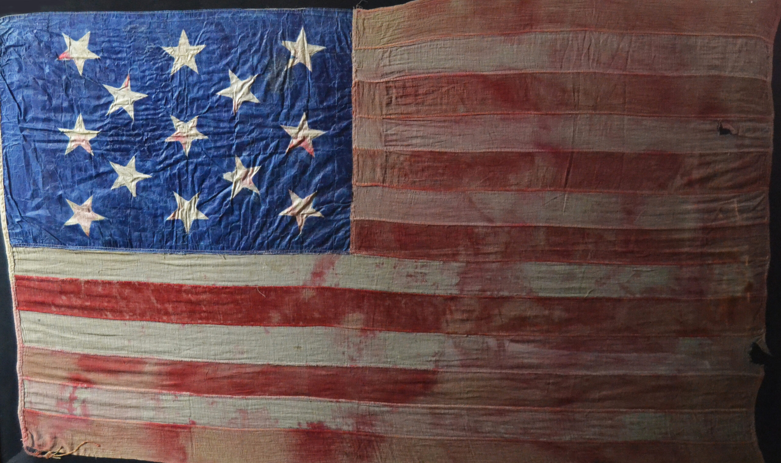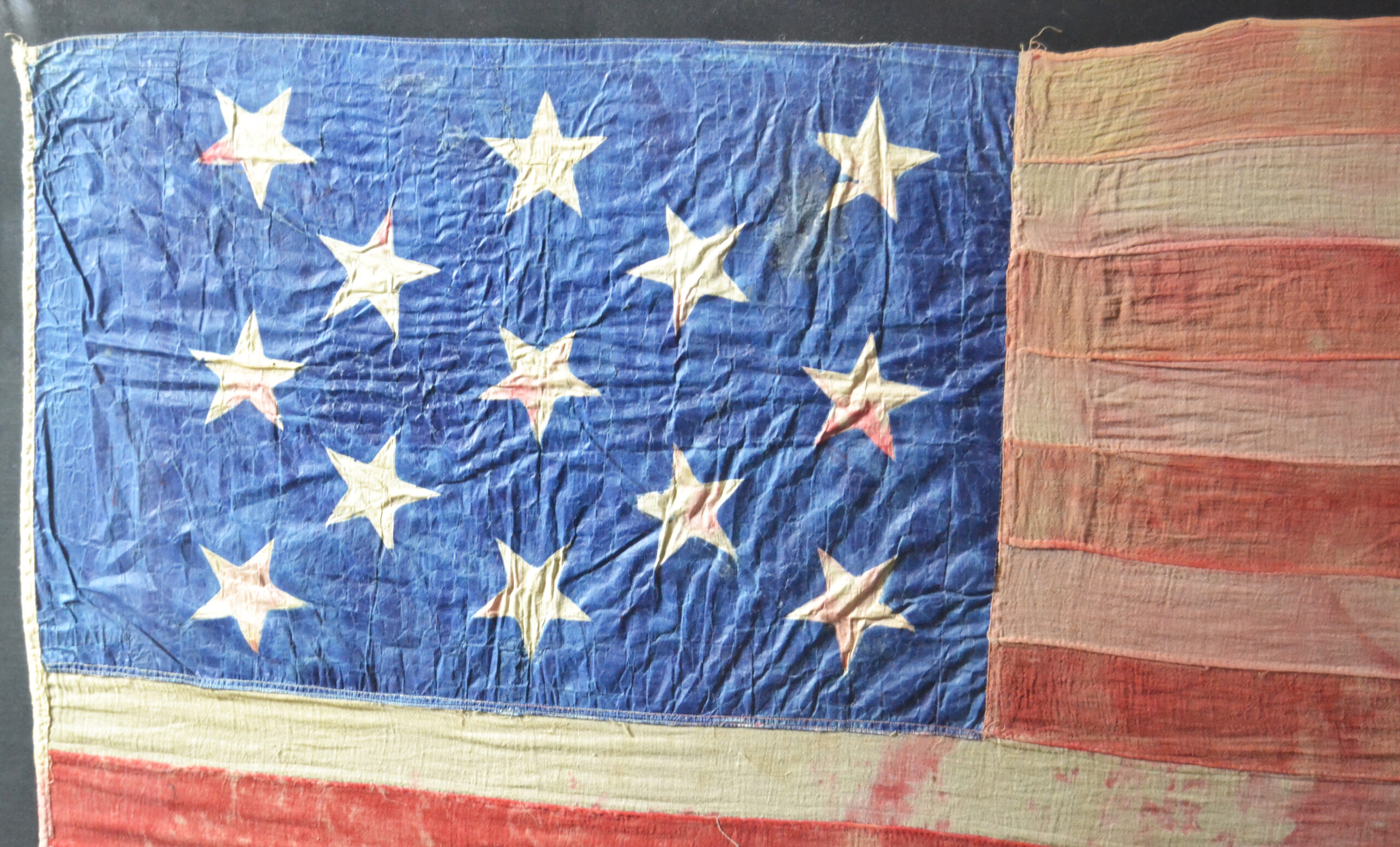 Fading throughout from age wear and use. Army’s have been using painted flags or stenciled flags since the 1400’s. The Army also used hand painted silk flags all through the civil war . This is a very rare 13 star flag.