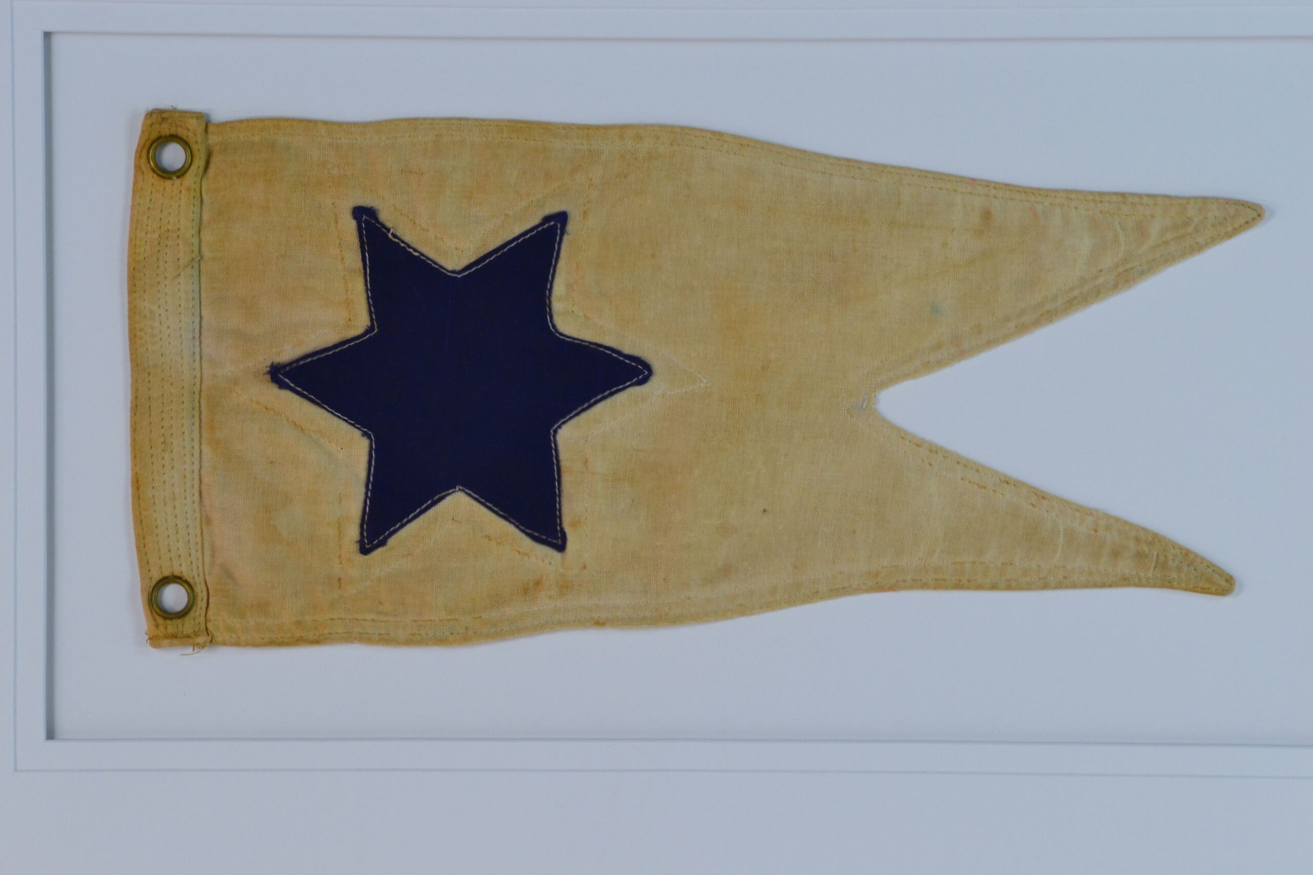 Incredible and rare antique boat, yacht or sailboat swallowtail pennant with a double applique six pointed star. Made of wool, treadle sewn with hand stitching on the star. Two brass grommets on a canvas hoist. Circa 1870-1890