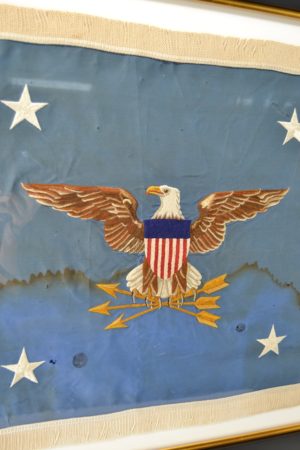 Secretary of The Navy Fender Flag. The flag dates to the end of WWII era to Korean War era. Made of heavy weight satin material. Double sided with gold fringe. incredible detailed embroidery. Sleeve house as to slide on to the flag staff on the vehicle fender. Fender flags are extremely rare. The flag does have some moisture staining but the other that it’s in really fine condition.